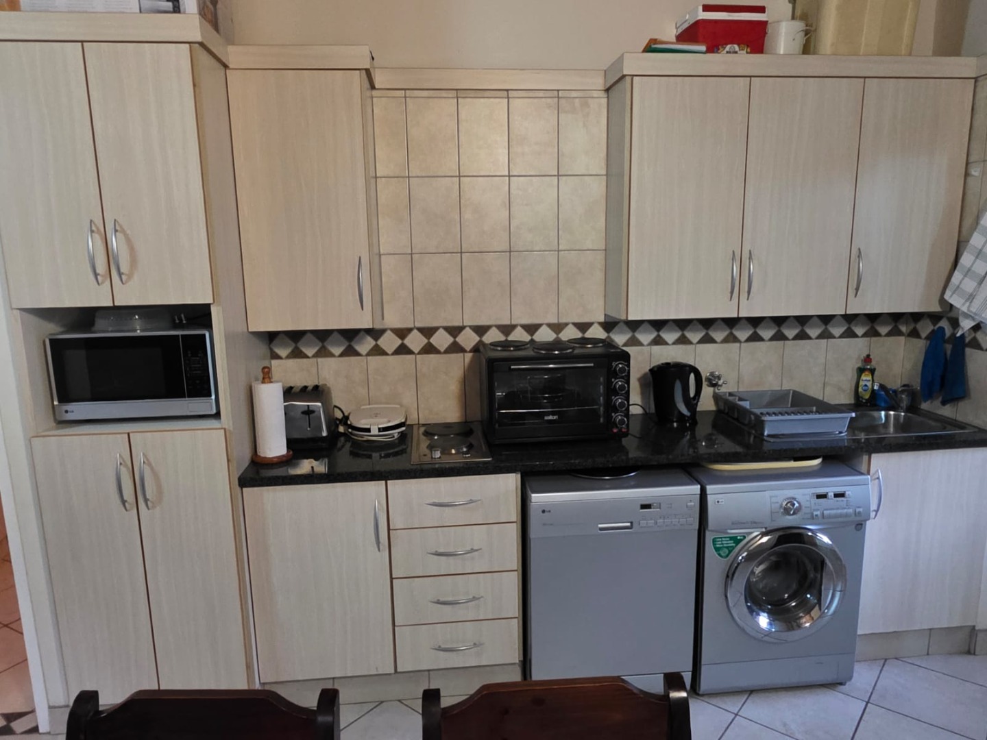The interior of this residence is thoughtfully designed for ease of maintenance and practical living, featuring durable tiled flooring throughout. The heart of the home comprises a well-appointed kitchen, which is equipped with an array of modern conveniences including a dishwasher, a washing machine, and an integrated space for a microwave. A functional countertop hob with a toaster oven further enhances its utility, complemented by ample cabinet and drawer storage solutions. This culinary space flows effortlessly into an open-plan lounge area, which benefits from abundant natural light, creating an inviting atmosphere for relaxation and daily living. The lounge provides direct access to a private outdoor paved patio, extending the living space into a delightful al fresco setting.